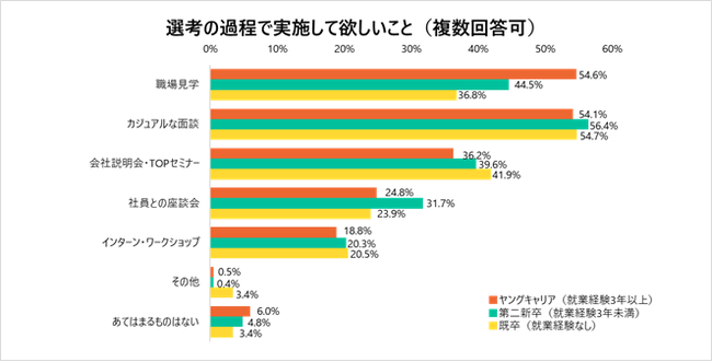 ヤングキャリアが、選考の過程で実施して欲しいことは「職場見学」が54.6%で最多。次いで、「カジュアルな面談」54.1%、「会社説明会・TOPセミナー」36.2%が続きました。第二新卒は、「カジュアルな面談」が56.4%で最多。次いで、「職場見学」44.5%、「会社説明会・TOPセミナー」39.6%が続きます。既卒で最も多かった回答は、第二新卒と同じく「カジュアルな面談」54.7%。次いで、「会社説明会・TOPセミナー」41.9%、「職場見学」36.8%が続きました。ヤングキャリア、第二新卒、既卒ともに上位3位に入った項目は同じでしたが、順位は異なる結果となりました。就業経験年数が長いヤングキャリアは「自分の目で見て確かめたい」意向が強く、就業経験年数が短い第二新卒・就業経験がない既卒は、「人事担当者などの話を聞いて、理解を深めたい」という意向が強いと推察されます。