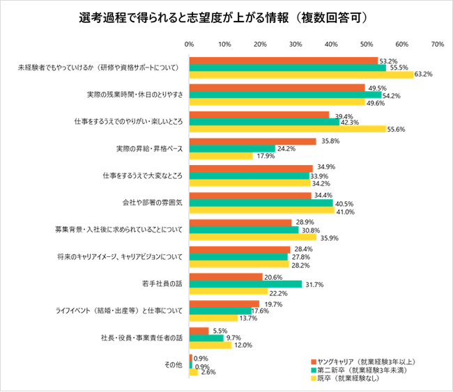 選考過程で得られると志望度が上がる情報は、「未経験でもやっていけるか(研修や資格サポートについて)」が最多。次いで回答を集めた項目は、ヤングキャリアと第二新卒が「実際の残業時間・休日のとりやすさ」、既卒が「仕事をする上でのやりがい・楽しいところ」となっています。既卒が「仕事をする上でのやりがい・楽しいところ」と回答した割合は、ヤングキャリア・第二新卒より10ポイント以上高くなっています。他の層と比較して回答割合が高かった項目は、ヤングキャリアが「実際の昇給・昇格ペース」、第二新卒が「若手社員の話」となりました。ヤングキャリアは「今後のステップアップのイメージ」、第二新卒は「働く環境や、一緒に働く社員の雰囲気」、既卒は「仕事内容」について、より理解を深めたいと考えているとうかがえます。