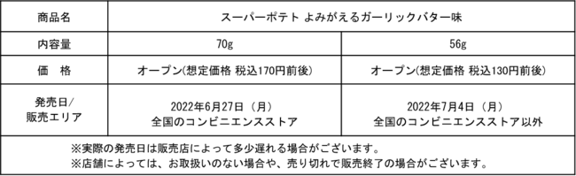カルビー株式会社(本社:東京都千代田区、代表取締役社長:伊藤 秀二)は、香料「フリス(R)」を使った濃厚な味付けの厚切りポテトチップス「スーパーポテト」より、新商品『スーパーポテト よみがえるガーリックバター味』を2022年6月27日(月)より、コンビニエンスストア先行で期間限定発売(8月上旬終売予定)します。コンビニエンスストア以外の店舗では、2022年7月4日(月)から発売します(10月上旬終売予定)。