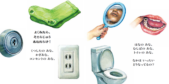 「中身や本質は外からはわからない。だからこそ想像しよう!」というメッセージを、子どもたちに楽しく伝えたい――そんなチョーさんの思いがたくさんちりばめられた本作。ページをめくると、どの穴の中にも想像もしない世界が広がっています。ぜひお子さんといっしょに【穴】の中を想像しながら楽しんでみてください!