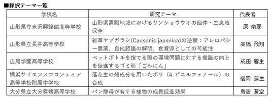 「サイエンスキャッスル研究費2025アサヒ飲料賞」では、「『健康』『環境』『地域共創』などの社会課題の解決に役立ち、未来のワクワクや笑顔を生み出す研究や開発」に沿った研究テーマを全国の中高生から募った結果、47件の応募があり、審査を経て5件を採択しました。