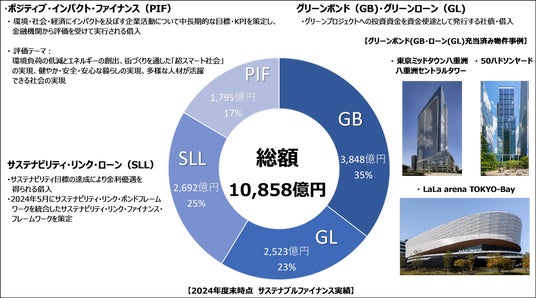 2023年度は総額2,300億円、2024年度は総額300億円のグリーンボンド発行をはじめ、グリーンローン、サステナビリティ・リンク・ローンおよびポジティブ・インパクト・ファイナンスなど、多様なサステナブルファイナンスの手法を用いて調達を実施してきました。2025年3月末時点において、三井不動産のサステナブルファイナンス調達額は累計額10,858億円となっております。