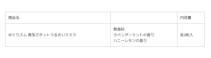 そこで、乾燥しがちな就寝時に向けた「めぐりズム 蒸気でホットうるおいマスク」を昨年、限定エリアで発売しました。開封するだけで温まり、約40℃のあったか蒸気が約15分続いてマスク内がじんわりうるおいます。かぜやせきの飛沫、乾燥が気になるときに手軽に使えます。飛行機での移動時やホテルなど外出先でもおすすめです。限定エリア発売での好評をうけ、このたび、『めぐりズム 蒸気でホットうるおいマスク ラベンダーミントの香り』の展開地域を全国に拡げます。また同時に、香りのバリエーションとして、「無香料」「ハニーレモンの香り」を新発売します。香りの好みで選べます。