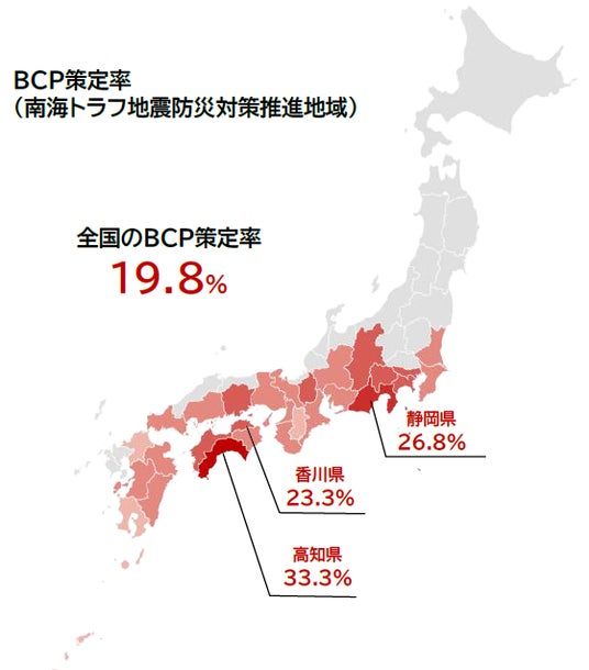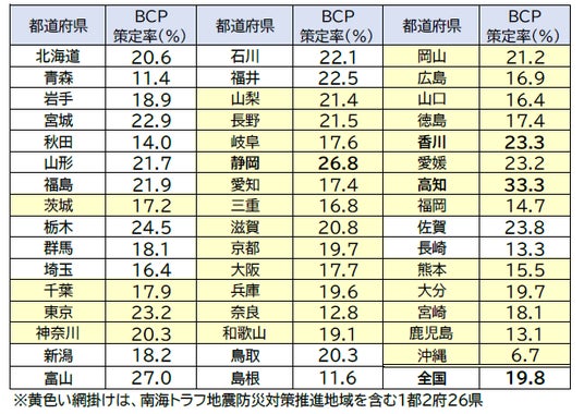 BCP策定率は全国平均で19.8%となるなか、指定された29都府県のうち高知県が33.3%でトップとなり、以下、静岡県26.8%、香川県23.3%の順で高かった。今回の地震で震源に近い宮崎県は18.1%と全国平均を下回る結果だった。