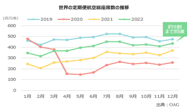 前年同日比で1,914.1%(約19倍)と大きく伸びておりますが、コロナ前の2019年比では2割程度となっております。世界の定期便航空総座席数の推移と比較し、2022年12月の日本における国際線航空座席供給数はコロナ前の45.6%(約5割減)となっており、座席数そのものが戻しきれていないことが分かります。(出典:CIRIUM https://www.cirium.com/jp/ 、参考:2020年1月5,676,003席、2022年12月2,588,530席、2022年11月19日時点)