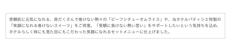 この度、プリンスホテルでは多くの受験生がお泊まりになるこの時期に、受験生を応援する“受験に負けない”祈りを込め「まけない飯」付き宿泊プランを企画するに至りました。各ホテル趣向を凝らし創作しており、それぞれエピソードにも注目です。