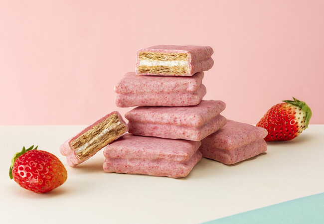 シュガーバター香るさくさくのミルククリームサンドをまるごとひとつ、ストロベリーショコラで贅沢に包みこみました。こだわりは、さくっとかむと一気に広がるジューシーな『いちごミルク味』。“キュン”と甘酸っぱい苺ショコラと、まろやかでコクのあるミルククリームがとろけあう、春のごちそうサンドです。