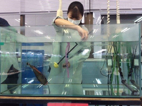 水生生物を専門的に学ぶ実習室には、日本海に生息する生き物をはじめとした水生生物の水槽が多数あり、生き物の飼育や水槽管理だけでなくドルフィントレーニングの基礎となる「フィッシュトレーニング」を行う環境も整っています。