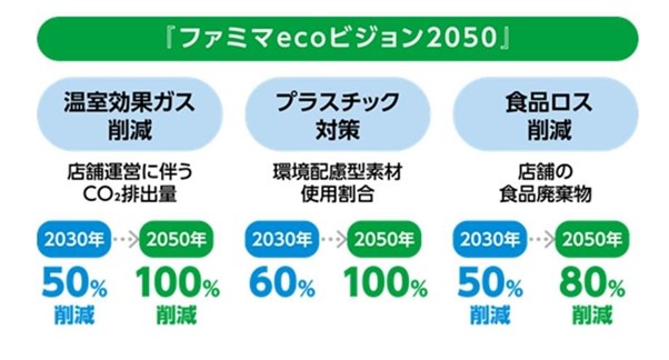 ファミリーマートは、2020年2月に「ファミマecoビジョン2050」を策定し、持続可能な社会の実現に貢献するため、2030年及び2050年に向けた中長期目標として、「温室効果ガス(CO2排出量)の削減」、「プラスチック対策」、「食品ロスの削減」の3つのテーマに基づき数値目標を設定しております。