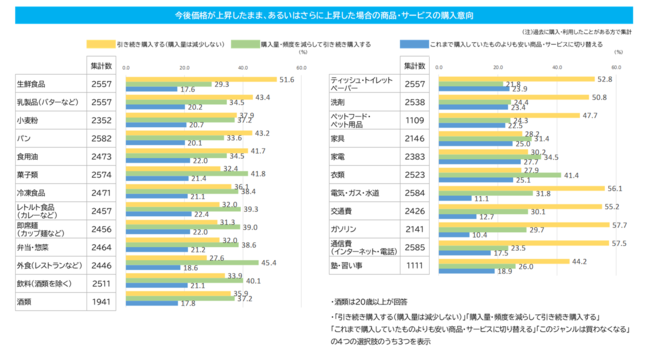 品目別の今後の購入について見ていくと、「引き続き購入する(購入量は減少しない)」が多い品目と、「購入量・頻度を減らして引き続き購入する」が多い品目に分かれる傾向が見られました。