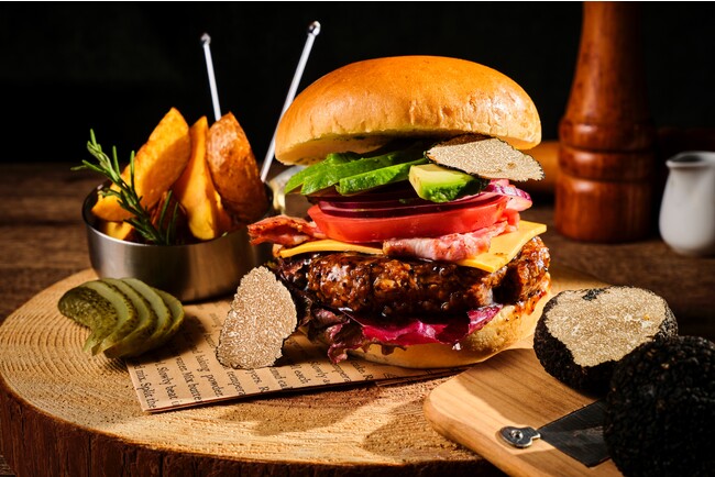バーガーの主役は、うまみがぎゅっと詰まったNAMIKI牛とジューシーな国産豚を合い挽きにした肉厚パティ。一口食べれば、パティから溢れる肉汁の旨味と、トリュフ入りてりやきソースのコク深い味わい、そして贅沢にスライスされたトリュフの芳醇な香りが口の中いっぱいに広がります。 色鮮やかなアボカドやトマトなどの野菜とチェダーチーズを合わせた、ボリューム感のある逸品です。