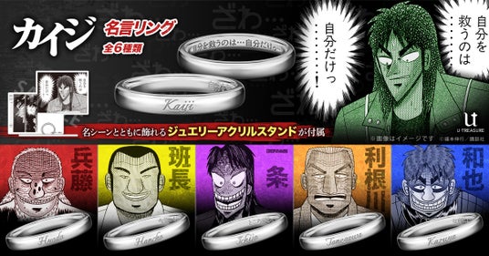 『カイジ』に登場するキャラクターの名前(カイジ、兵藤、班長、一条、利根川、和也)と“生きざまを刻む一言”を刻印した「名言リング」も同期間(2026年4月8日(水)~5月18日(月))予約を受け付けております。