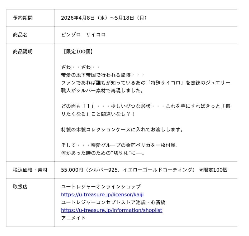 株式会社ユートレジャー(本社:東京都新宿区、代表取締役社長:青木 興一、株式会社ケイ・ウノの連結子会社)は、人気ギャンブル漫画『カイジ』とのコラボレーションアイテム「ピンゾロ サイコロ」を発売します。2026年4月8日(水)~5月18日(月)の期間、ユートレジャーオンラインショップ、ユートレジャーコンセプトストア池袋・心斎橋にて予約受付を行います。100個の数量限定です。ユートレジャーでは初めての取り扱いライセンスとなります。