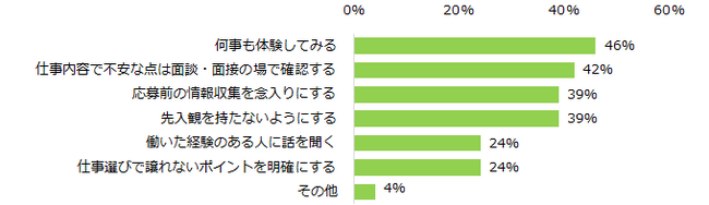 これまでにイメージとギャップを感じた仕事が「ある」と回答した方に、今後の仕事探しで注意しようと思ったことを伺うと「何事も体験してみる」(46%)、「仕事内容で不安な点は面談・面接の場で確認する」(42%)という結果でした。
