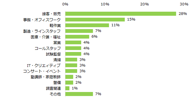 「今までに経験して良かったと思うお仕事は何ですか?」と伺うと、トップ3は「接客・販売」(28%)、「事務・オフィスワーク」(15%)、「軽作業」(11%)という結果でした。理由もコメントで紹介します。
