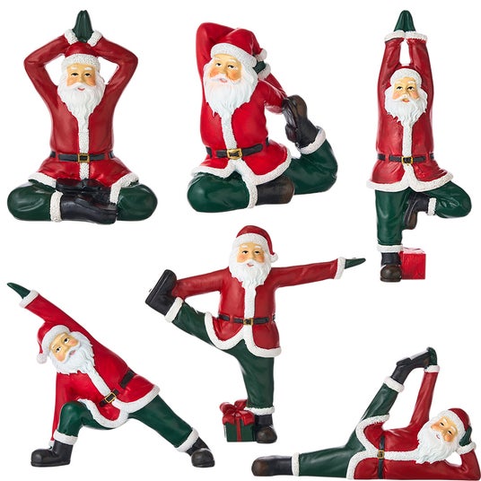 6パターンのヨガポーズをしたユニークなサンタの置物。