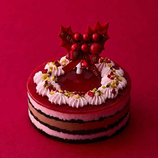 甘酸っぱいフランボワーズとほんのりビターなチョコ。2種類のムースが織りなすハーモニーを味わいながら、チョコパフのサクッとした食感もアクセントに。フランボワーズの色鮮やかなジュレとムースの両方にライチを加えて華やかな甘さをプラスしました。聖夜のリースを表現した天面のベリークリームもポイント。