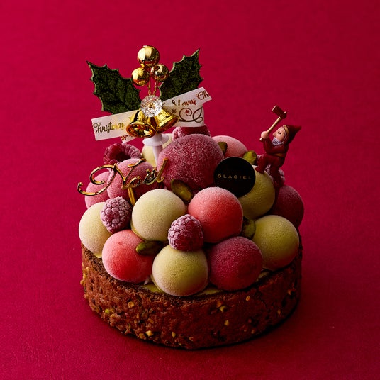 2種類のピスタチオを使ったクリームとムースで、ふくよかな香りと濃厚でコク深い味わいに仕上げました。まろやかな甘さのバニラホワイトチョコムースに忍ばせた甘酸っぱいグリオットチェリーのジャムが絶妙にマッチ。天面のクリームにドライフランボワーズを散りばめれば、聖夜にぴったりな、まるでクリスマスツリーのような彩りに。