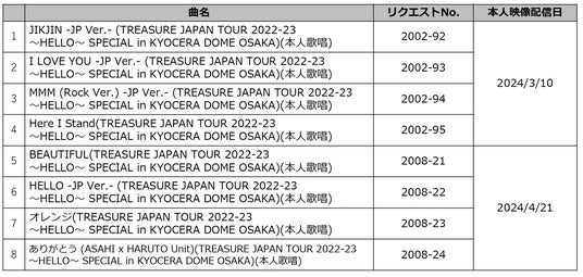 また、2023年1月29日に京セラドーム大阪で開催された『TREASURE JAPAN TOUR 2022-23 ~HELLO~ SPECIAL in KYOCERA DOME OSAKA』から、カラオケでも人気の8曲をLIVEカラオケとして配信します。
