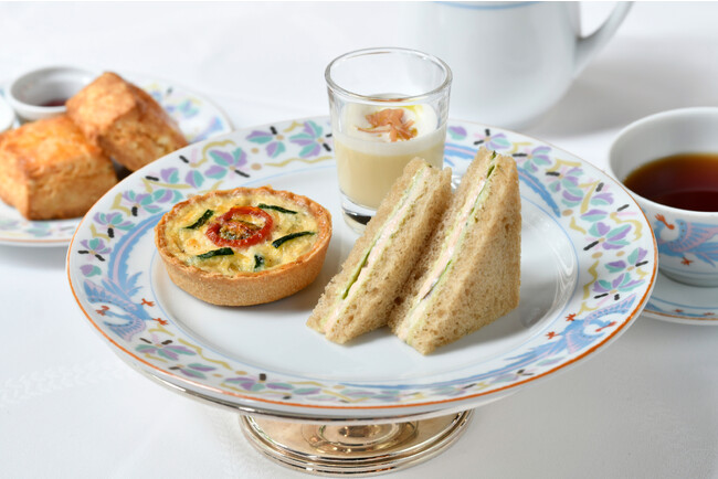 夏が旬のパイナップルや桃、野菜を使用したこだわりの各種ティーフーズをご用意しました。桃の形が可愛い優しい甘さの「桃のシブースト」や、様々なフルーツを盛り合わせ華やかで楽しい夏のイメージを表現した「フルーツポンチ」、なめらかな食感のパンナコッタにパイナップルのマリネを重ねた爽やかな味わいが魅力の「パインマリネとパンナコッタ」などのスイーツのほか、セイボリーにはトマトやズッキーニを使用した「夏野菜とモッツァレラチーズのキッシュ」「とうもろこしのブランマンジェ」など、旬の味わいを美味しくお楽しみいただけるアフタヌーンティーをご用意しました。クラシックなデザインのお皿を美味しく彩るティーフーズが、夏の午後の優雅なティータイムを演出します。開業時の佇まいを残す歴史感じるクラシックな空間とともにご堪能ください。