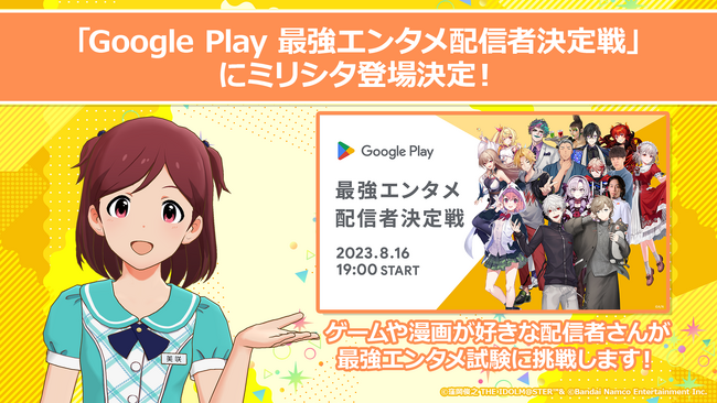 株式会社バンダイナムコエンターテインメントの「アイドルマスター ミリオンライブ! シアターデイズ」は、Google Play が オンライン上で開催する「最強エンタメ配信者決定戦」で、多くのファンに愛されているエンタメコンテンツの 1 つとして試験の内容に登場します。