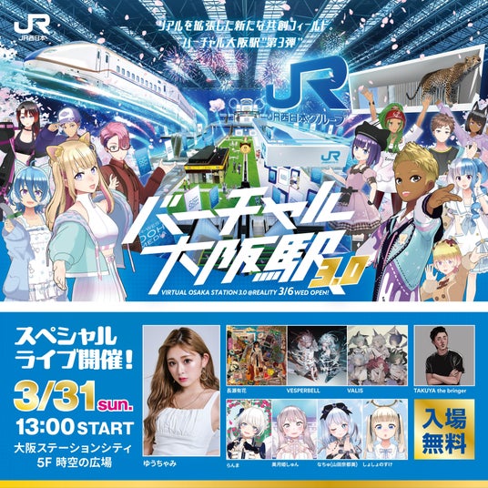 西日本旅客鉄道株式会社(本社:大阪市北区、代表取締役社長:長谷川 一明)、株式会社JR西日本コミュニケーションズ(本社:大阪市北区、代表取締役社長:伊藤 義彦)、株式会社JR西日本イノベーションズ(本社:大阪市北区、代表取締役社長:川本 亮)は、スマートフォン向けメタバース「REALITY(リアリティ)」において、「バーチャル大阪駅 3.0」を2024年3月6日(水)から期間限定で開業しています。リアルの「駅」をバーチャル上に拡張する「バーチャル大阪駅」の取り組みをより多くのお客様にご体感いただきたく、2024年3月31日(日)に大阪ステーションシティ5F 「時空の広場」において、スペシャルリアルイベント「バーチャル大阪駅 3.0 ライブフェス」を開催します。なお、この模様はバーチャル大阪駅 3.0特設ステージでもリアルタイムでお楽しみいただけます。