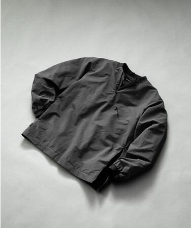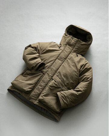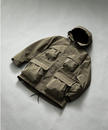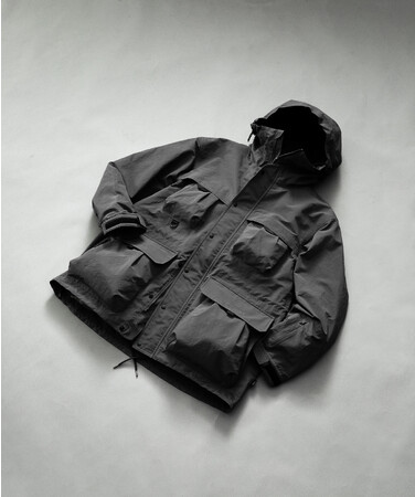 ネックは高めのスタンドカラーでネック全体を覆う事が可能。フードにはゴムスピンドルが入っているのでフィット感 の調整が可能となっています。胸、ウエスト部分のポケットはダーツとタックで立体的な仕様に。ギアやガジェットなど、大容量に収納できます。左袖口にもコンシールポケットを配置しているのでカードや小物を入れるのに便利です。内側のセンターネック部分には別売りのダウンカーディガンをワンタッチで脱着することのできるテープを配置しており、レイヤリングすることで衣服内温度を調整することができる汎用性を持った仕様です。ウエストと裾にはスピンドルを通すことによってシルエットを変化させることができます。フード後ろにもサイズ調整用のアジャスターがあることにより、フード口周囲だけではなく全体のフィット感を高めることが可能です。