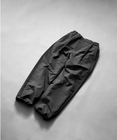 ウエスト~ヒップ周りに深めのタックを取ってゆとりを持たせており、程よくルーズフィット感のあるシルエット。フロントはステッチレスなミニマムな表情に。裾はゴムスピンドルを通してシルエットを変化させたり、たくしあげたりする際に便利な仕様。左後ろポケットはスマホなどを入れるのに便利なサイズで脇線へ極力近づけることにより、椅子などに座った時に身体に干渉 しないような設計に。右後ろポケットは大容量のマチ付きポケットになっているのでシーンによって様々なものを入れて使用することが出来ます。