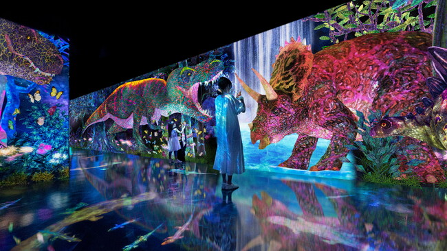 アート集団チームラボは、ティラノサウルスやトリケラトプスなど様々な種類の恐竜を捕まえ、観察し、自分のコレクション図鑑をつくっていく展覧会「Galaxy & チームラボ:捕まえて集める恐竜の森」を、Galaxy Harajuku(東京・原宿)にて、2023年4月8日(土)から開催します。本展は、《捕まえて集める神秘の森》、《捕まえて集める恵みの海》に続き、スマートフォンを片手に、自らの身体で探索する、Galaxy Harajukuと共同で開催する展覧会の第3弾。現在展示中の、海の生き物を捕まえ、観察する《捕まえて集める恵みの海》は3月26日(日)まで。