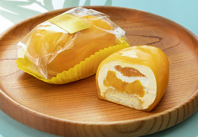 見た目はもちろん、味わいもマンゴー尽くしの『THEマンゴー』。つやつやの「マンゴージュレ」にぎっしりと包まれているのは、カスタードにバターを加えた自家製の「マンゴーバタークリーム」。バターのコクとマンゴーの甘みが隠れた、くちどけなめらかなバタークリームです。