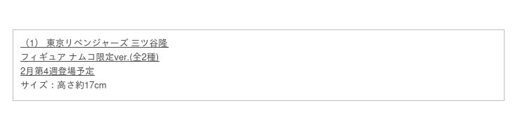 期間中、ナムコ限定描き下ろしイラストを使用した「ホログラム缶バッジ」や「スタンド付きアクリルプレート」、「三ツ谷隆」のフィギュアなど計3種のナムコ限定アミューズメント景品が「namco」および「とるモ」のクレーンゲーム機に登場します。