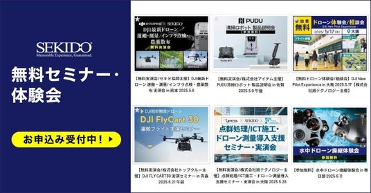 セキドでは、より多くの事業者の方にドローンを使った業務効率の改善を実現していただくため、業務用ドローンや関連ソリューションをご紹介する無料セミナーやイベントを定期的に開催しております。今後もオンラインや全国各地での開催を予定しておりますので、ご興味をお持ちのイベントにはぜひお気軽にご参加ください。