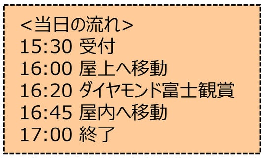 また、各日15名限定(計75名)で普段立ち入ることのできない、サンシャイン60ビルの屋上を開放し、地上227mの高さで都心の空気を感じながら「ダイヤモンド富士」をお楽しみいただけます。