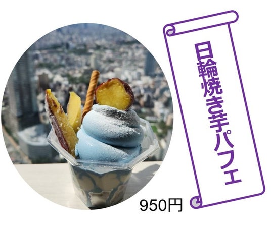 昨年に引き続き今年も!てんぼうパークCAFEの熟成焼き芋パフェがダイヤモンド富士限定仕様に!青いソフトクリームは白い粉砂糖をかぶり、