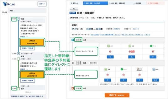 「旅CUBE」から、新幹線・特急列車の利用を含むJR西日本およびJR四国エリアで完結したルートを検索した際、「JR西日本e5489列車予約」(「e5489」への遷移)ボタンが表示されます。ダイレクトに指定した新幹線・特急券の予約画面に遷移し、再度日付、区間、時間等の情報を入力せずにきっぷの予約・決済ができます。