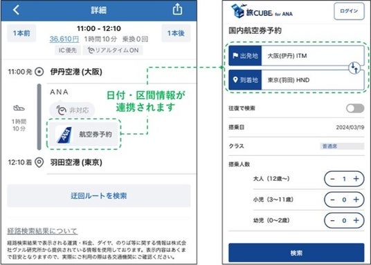 *3 旅CUBEは、ご旅行やご出張など「旅」の移動・旅程のプランニングをサポートし、旅行計画時に自宅から目的地までの最適な経路、航空券をご案内します。会員登録すると、旅の計画をスケジュールとして管理、保存、共有も可能です。さらに、航空券の予約や空港までの電車、バス、タクシーなどのチケット予約、お得なクーポンが取得可能です。