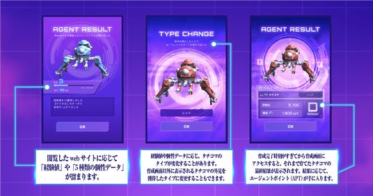 閲覧するWebサイトに応じて「経験値」や5種類の「個性データ」が蓄積。一定条件を満たすことでタチコマの姿が変化します。育成が完了すると、その結果に応じてエージェントポイントが溜まります。