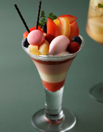 他にもフレッシュスライスはもちろんコンポート、ムースなどが層をなして盛り込まれており、心ゆくまで旬のフルーツをお召し上がりいただけます。