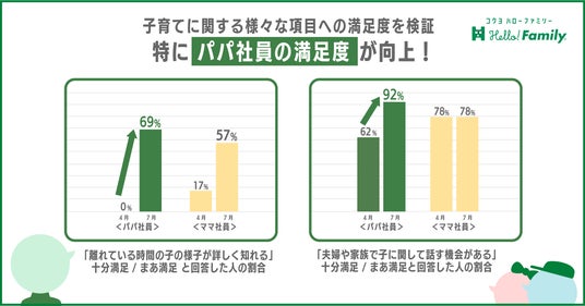 今回のアンケート調査では、子育てに関する様々な項目への満足度を、検証の前後で比較しました。「離れている時間に子どもの様子が詳しく知れる」という項目について、「十分満足」・「まあ満足」と回答したパパママ社員は9%であったのに対し、Hello! Family.導入後は61%と大幅な向上が見られました。パパ社員はついては、検証前は0%だったのに対して、69%に増加しており、ママ社員と比べて、よりポジティブな変化が見られています。