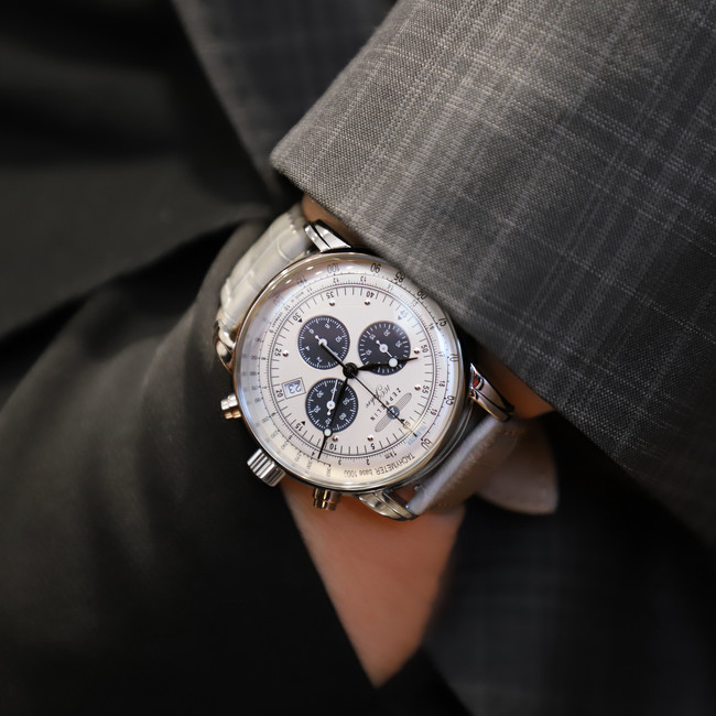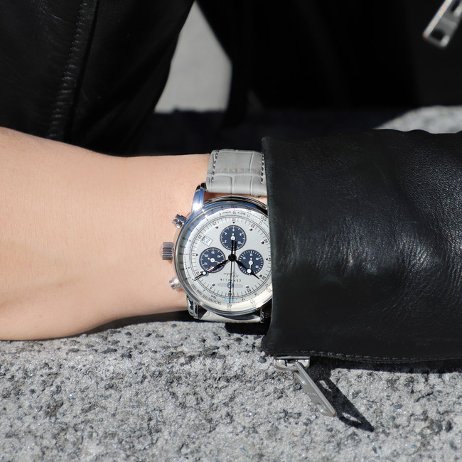 文字盤には、ガルバニック加工したメタリックアイボリーダイヤルを採用し、グレーのサブダイヤルが腕時計のデザインを引き締めます。