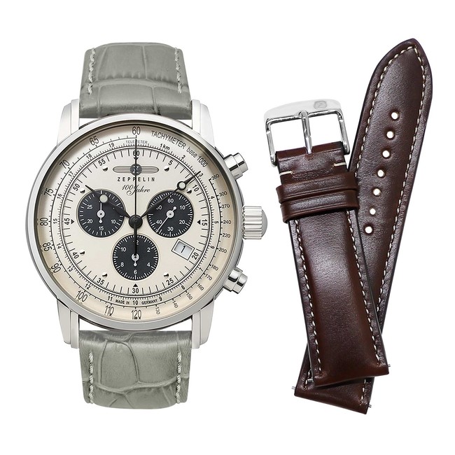 「100周年記念シリーズ 日本限定クロノグラフ 阪急メンズ東京 FORTUNE TIME限定セット」は、飛行船の機体の色をイメージしたグレーのクロコ型押しカーフレザーベルトと、シンプルでありながら艶が味わい深いダークブラウンのスムースカーフレザーベルトのスペシャルセットです。