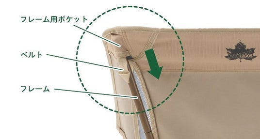 また、チェアシートの2ヶ所に指をかけるベルトが付いているため、フレーム用ポケットにフレームを差し込みやすく、簡単に組み立てられます。ハイスタイルとロースタイルの切り替えは、脚フレームの差し込みを入れ替えるだけなので楽に切り替えが可能です。