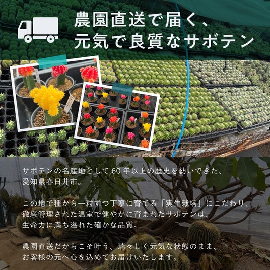 本商品には、サボテンの産地として知られる愛知県春日井市の農園で、一株ずつ丁寧に育てられたサボテンを使用しています。