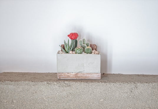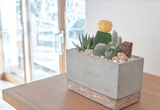 無機質なセメントの質感に、木のような風合いを思わせるペイントを施したミニマルなデザインに、個性豊かなサボテンを寄せ植え。