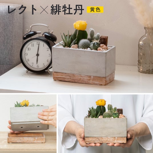 「レクト」は、コンクリートのような質感を持つセメント鉢に、個性豊かなサボテンを寄せ植えたインテリアグリーン。