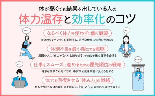 本書では、5つの章にわたって35の具体的戦略を紹介しています。第1章では限られたエネルギーの適正配分方法、第2章では体力を使わない効率的な働き方、第3章では体調不良を最小限にする予防策、第4章では仕事をスムーズに進める優先順位の付け方、第5章では体力を回復させる休み方について詳しく解説。