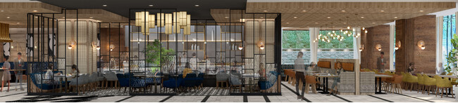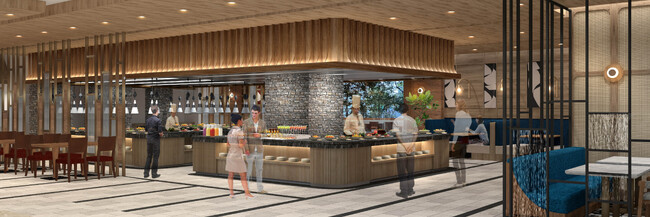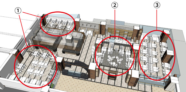 ビュッフェ台に近く、しっかりと食事をお召し上がりいただく空間として「Dining hall area(下段)」と「Terrace dining area(上段)」の2つのコンセプトエリアを設けます。グループやファミリーに最適なソファー席をご用意するとともに、やわらかい間接光と落ち着いた雰囲気の中でお食事をお楽しみいただけます。