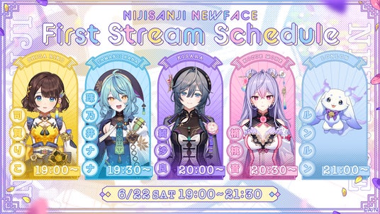 YouTubeでの初配信は各ライバーのチャンネルにて、2024年6月22日(土)19:00よりリレー形式で行います。また、デビュー楽曲『シャオシャオ蘭々♪』は現在MV公開&デジタル配信中!司賀りこ、珠乃井ナナ、綺沙良、梢桃音、ルンルンの初配信、デビュー楽曲をぜひお楽しみください。