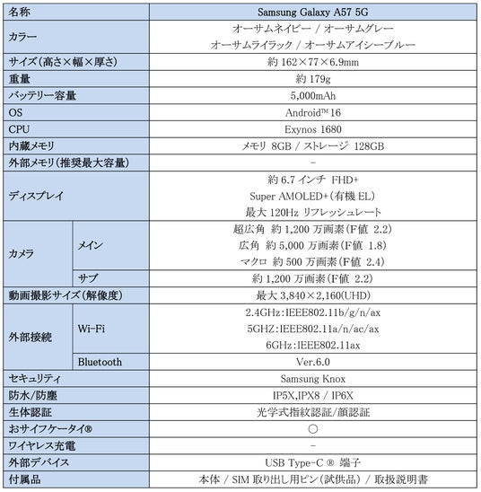 <主な仕様:「Samsung Galaxy A57 5G」>
