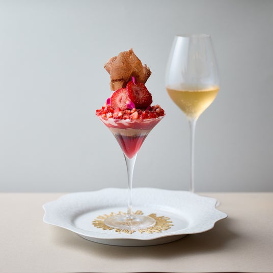 タンザニアのビーントゥーバーのチョコレートの華やかで苺や林檎のような香り、真っ赤なイメージの色彩を表現したパフェです。延命寺シェフが、このチョコレートなら苺とマリアージュすると確信して作られた一品です。